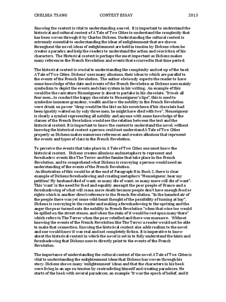 It highly criticizes the reign of terror that swept through Paris and the French countryside during the French Revolution. At the same time, Dickens sympathizes with the French aristocracy that has been overthrown and slain. When writing the book, Dickens minimizes his characterization of the men and women populace in the a tale of two cities essay. In doing that, a tale of two cities essay, he achieves a somewhat modern feel for the novel; although it was set in the s and written in the s.