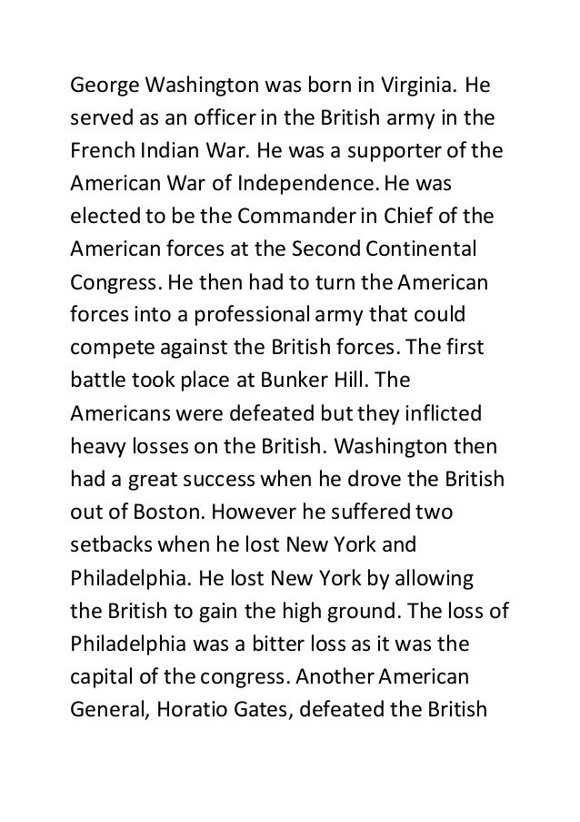 George Washington was born on February 11, Augustine Washington was of English descent with ancestors coming from Sulgrave in England. His grandfather John Washington emigrated to Virginia in Augustine was a tobacco planter whose plantation was worked by slaves. Augustin died when George was only 11 years old and he was brought up by his half-brother, Lawrence George washington essay paper. Between the years of andGeorge Washington was the Commander-in-Chief of the Continental Army.