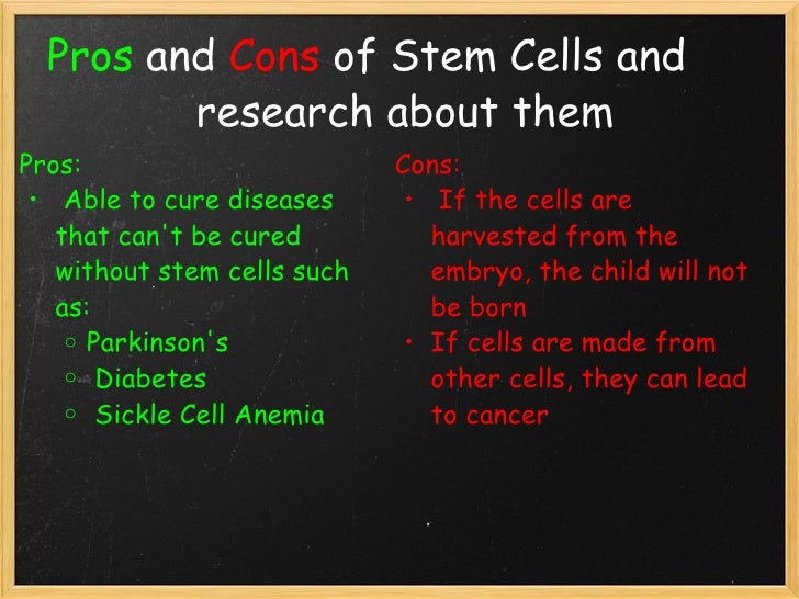 Jun 03, · In April of , Senators Arlen Spector and Tom Harkin introduced the Stem Cell Research Act of This would allow federal researchers to extract stem cells from embryos. They believe this research to be ethical and definitely beneficial The pros of stem cell research are unlimited potential for possible cures to diseases such as Alzheimer’s disease, Parkinson’s disease, diabetes, stroke, bone diseases, and screening drugs for pharmaceutical companies, instead of using animals to test drugs Pros. Trans differentiate and and reprogramming of these cells is possible but is not well studied. Thought to be less likely to be rejected if used in transplants. Success has already been demonstrated in various clinical applications